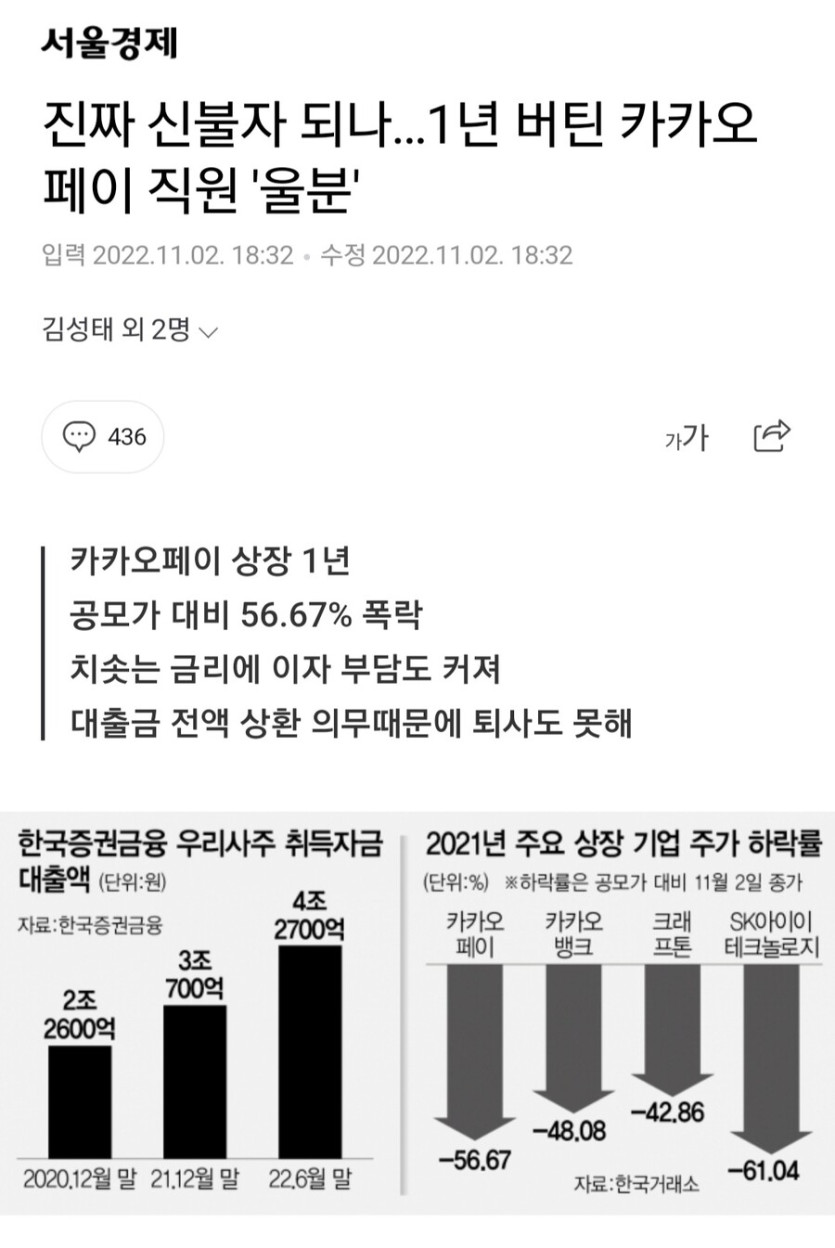 “공모주로 받은 우리사주의 주가 하락뿐만 아니라 치솟는 주식담보대출과 마이너스 통장 금리로 인해 엎친 데 덮친 격입니다.