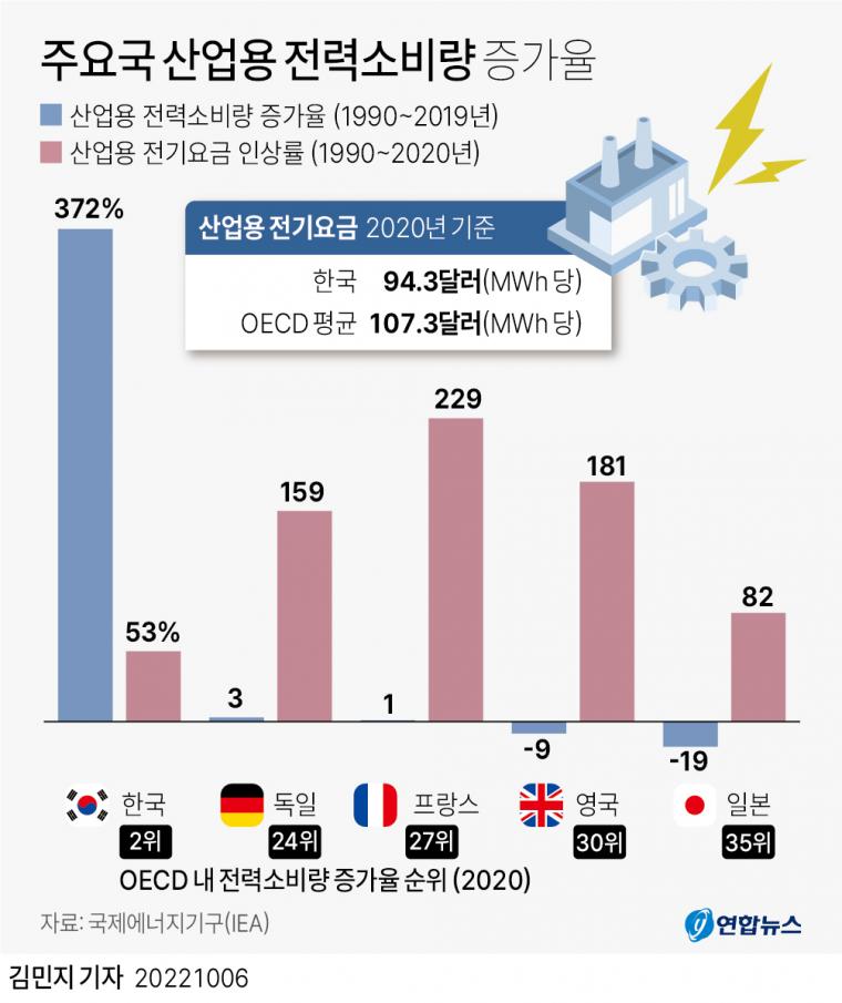 6일 국제에너지기구(IEA) 통계에 따르면 1990∼2019년 우리나라의 산업용 전력소비량 증가율은 372%(4.7배)로, OECD 국가 중 2위였다.