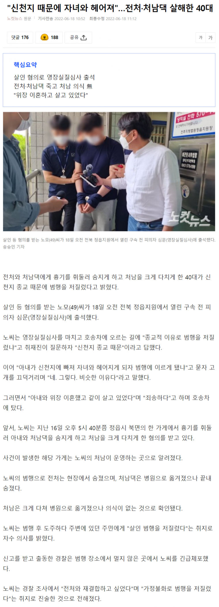 "신천지 때문에 자녀와 헤어져"…전처·처남댁 살해한 40대 남성...