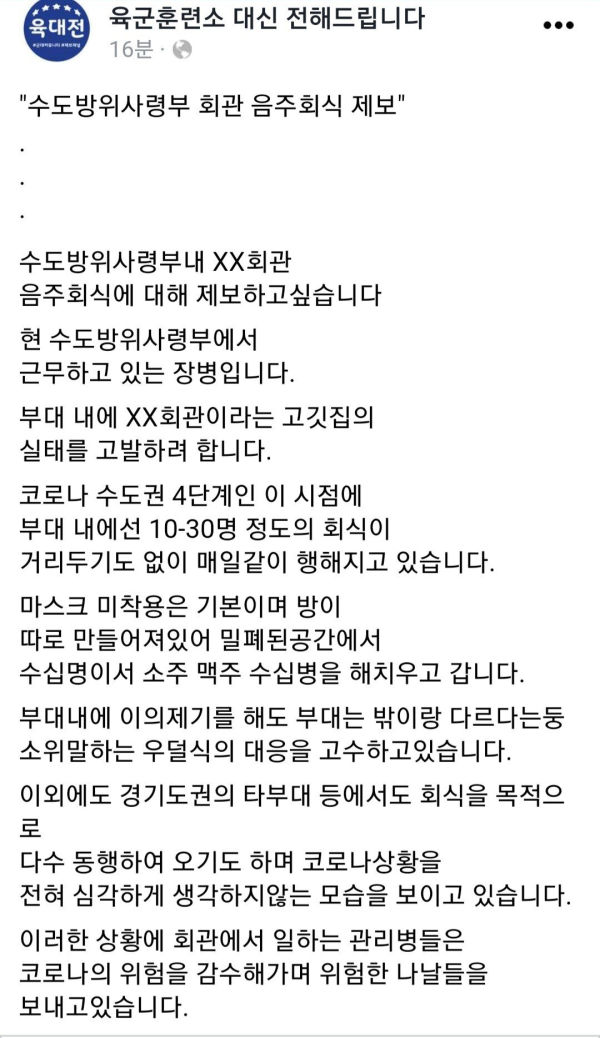 수도방위사령부 회관 음주회식 방역수칙 위반