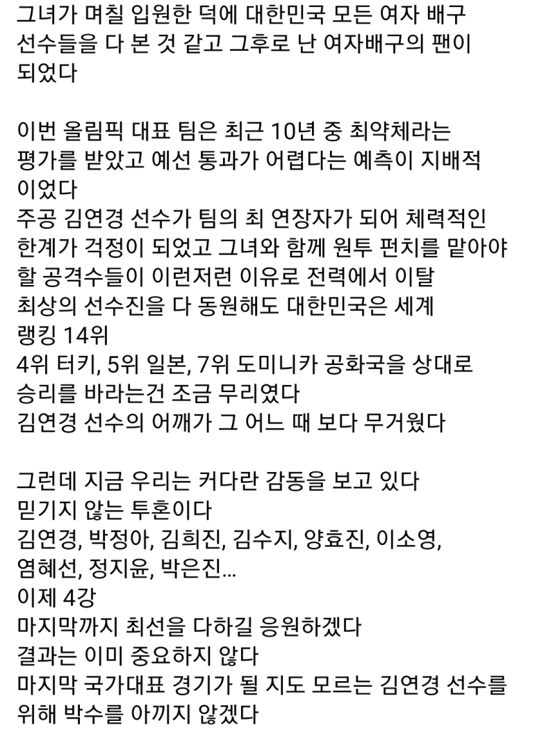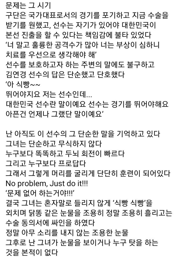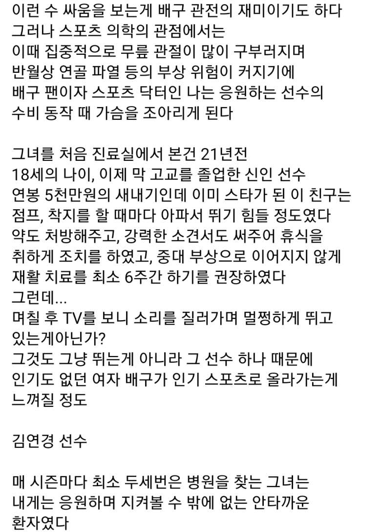 김연경 선수를 치료했던 한양대 교수의 응원 글