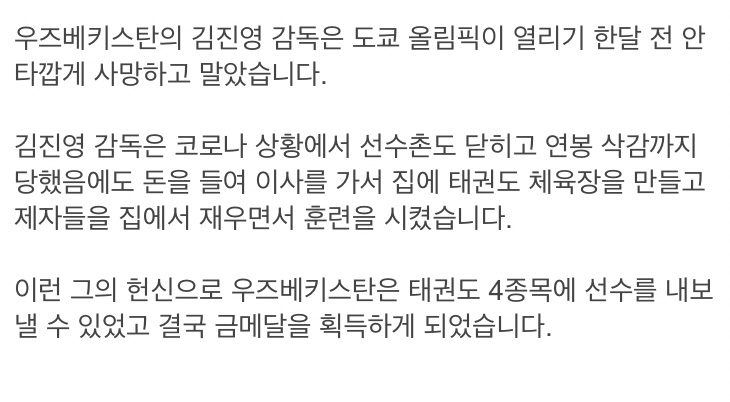 우즈벡 태권도 금메달을 지켜보지 못한 코치