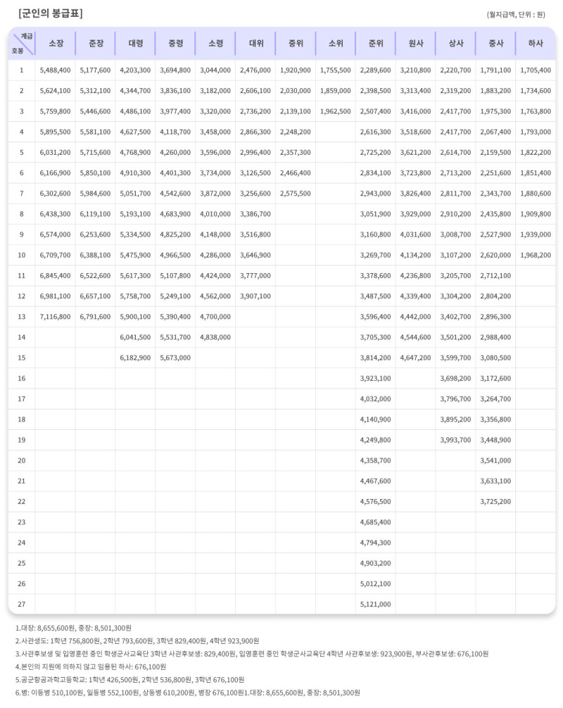 군무원, 군인의 봉급표는 세전 금액으로 추가수당을 제외한 기본급만 나타낸 봉급표이며,