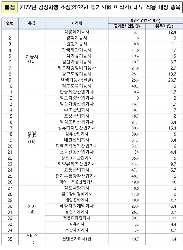 검정시행 조정제도 적용대상 종목 (출처=큐넷)